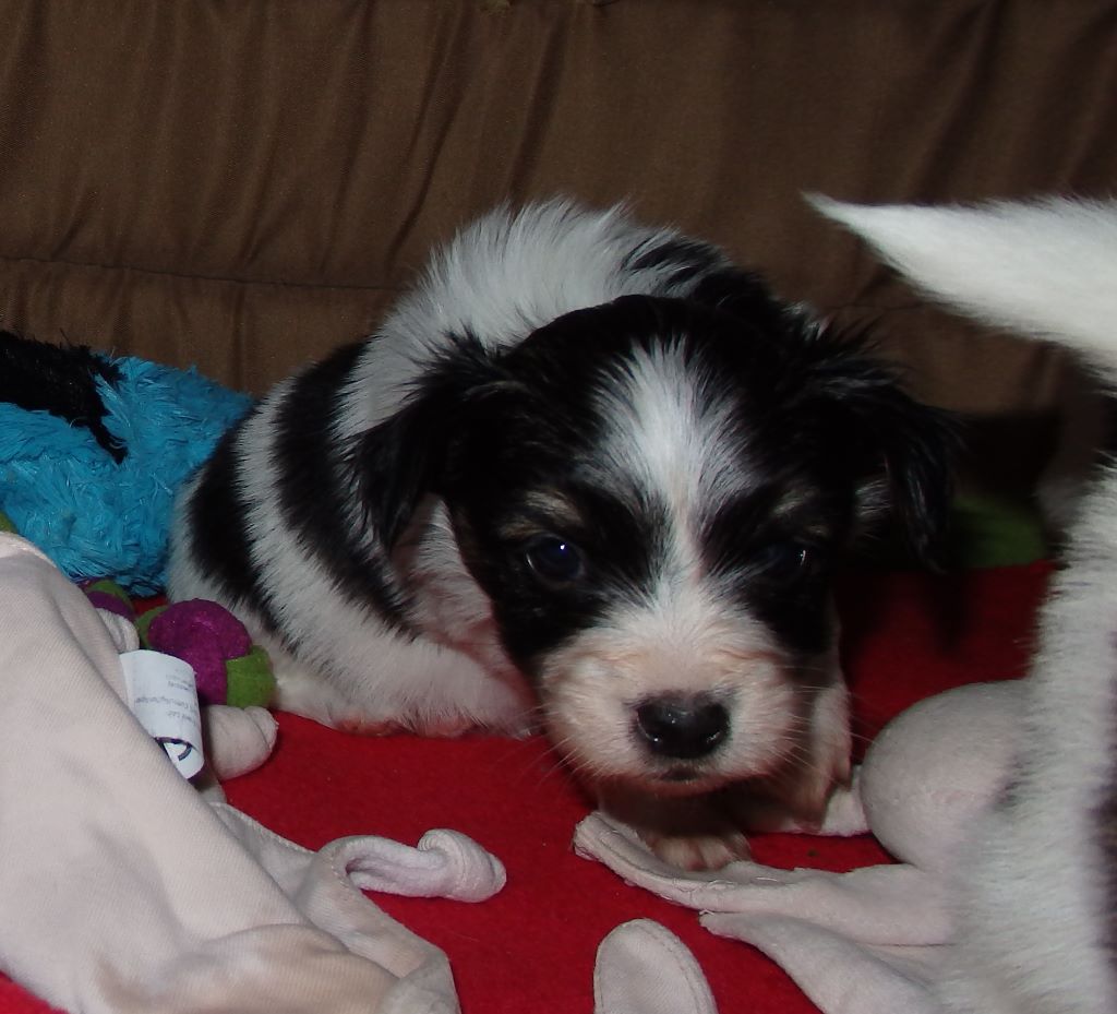 Tricolore. 169g à la naissance, 625 g à 4 semaines, 1050g à 2 mois, 1.600g à 3 mois, très jolie puce avec une belle liste.